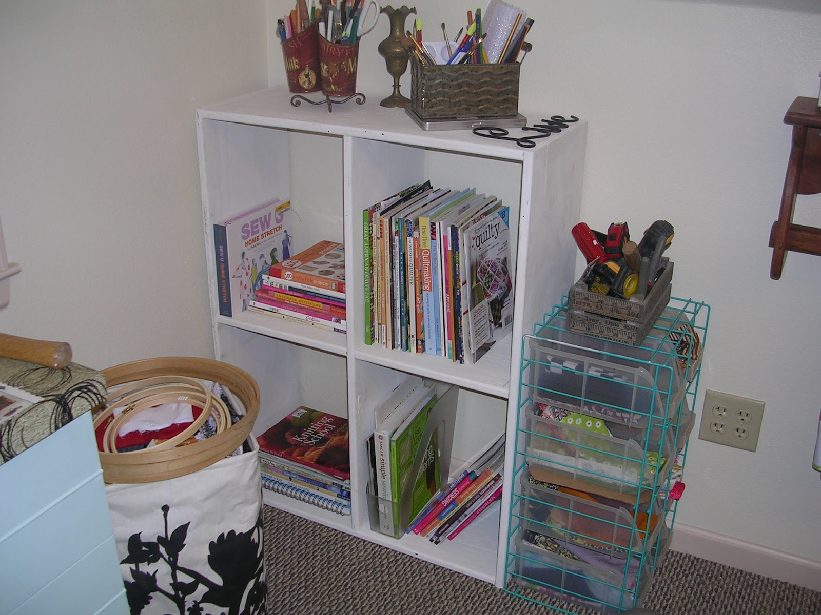 Shown below - to the right of the cutting table are books, fabrics, threads, and my completed quilts.